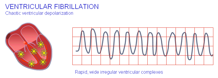 In VF, muscle contractions in the lower chambers of the heart become chaotic, and can no longer pump blood to the body.