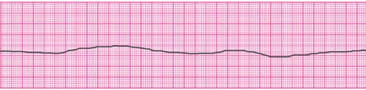 On a monitor, asystole is often described as being a flat line. However, in practice, the line is not completely flat. There is, however, a lack of any electrical activity on the monitor. The trace below shows an example of asystole.